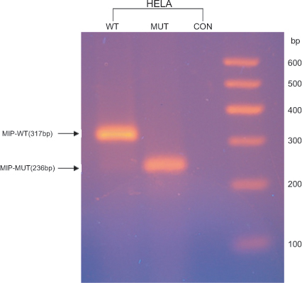 showed a 317 bp band, and RT–PCR of total RNA obtained from cells transfected with pcDNA3.1-MIP-MUT showed a 236 bp band.