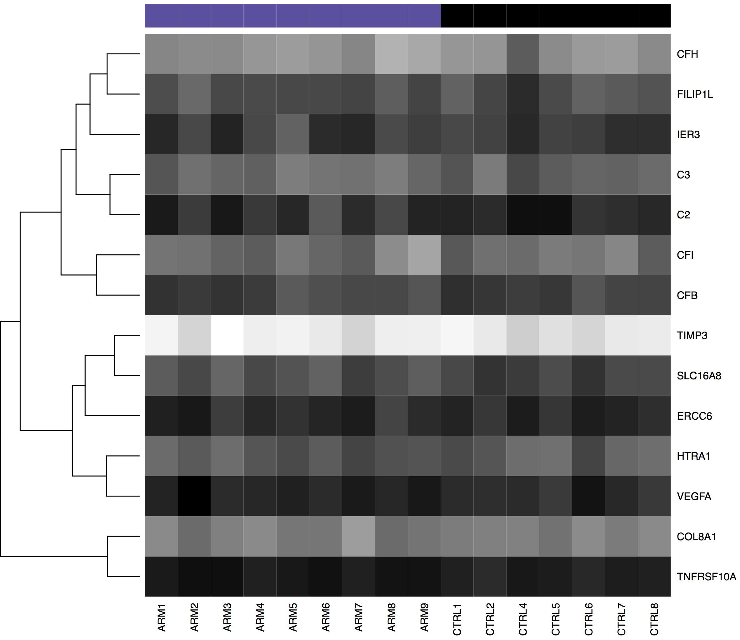 Heatmap of genes previously associated with or possibly implicated in AMD. Dark shading indicates low expression; light shading indicates high expression.