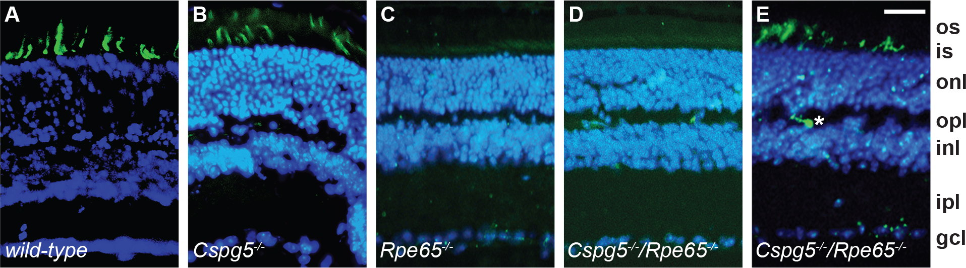 Cspg5−/− retinas (A, B). Residual staining of cone inner segments was observed in the central retina of the Rpe65−/− and Cspg5−/−/Rpe65−/− mice (C, D). In the peripheral regions of the Cspg5−/−/Rpe65−/− retinas, cone outer segment labeling was still observed, with mislocalization to the synaptic endfeet of cone photoreceptors