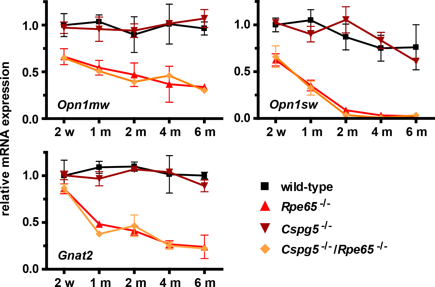 Figure 3. Time-course of cone-specific gene expression. The expression of the cone-specific M-opsin (Opn1mw), S-opsin (Opn1sw), and cone transducin alpha subunit (Gnat2) genes was assessed with quantitative PCR. Total RNA was extracted from the retinas of the wild-type, Rpe65−/−, Cspg5−/−, and Cspg5−/−/Rpe65−/− mice at ages 2 weeks (w) to 6 months (m). For each time point and genotype, three animals were analyzed in duplicate. Wild-type