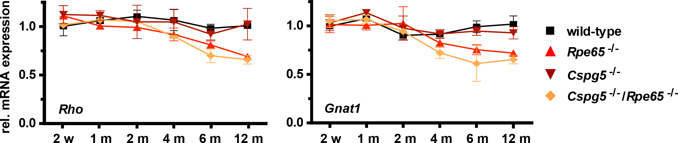 Figure 4. Time-course of rod-specific gene expression. Total RNA was extracted from the retinas of the wild-type, Rpe65−/−, Cspg5−/−, and Cspg5−/−/Rpe65−/− mice at ages 2 weeks (w) to 12 months (m). Rhodopsin (Rho) and rod transducin alpha subunit (Gnat1) gene expression was assessed with quantitative PCR, with four animals analyzed in duplicate for each genotype. Wild-type