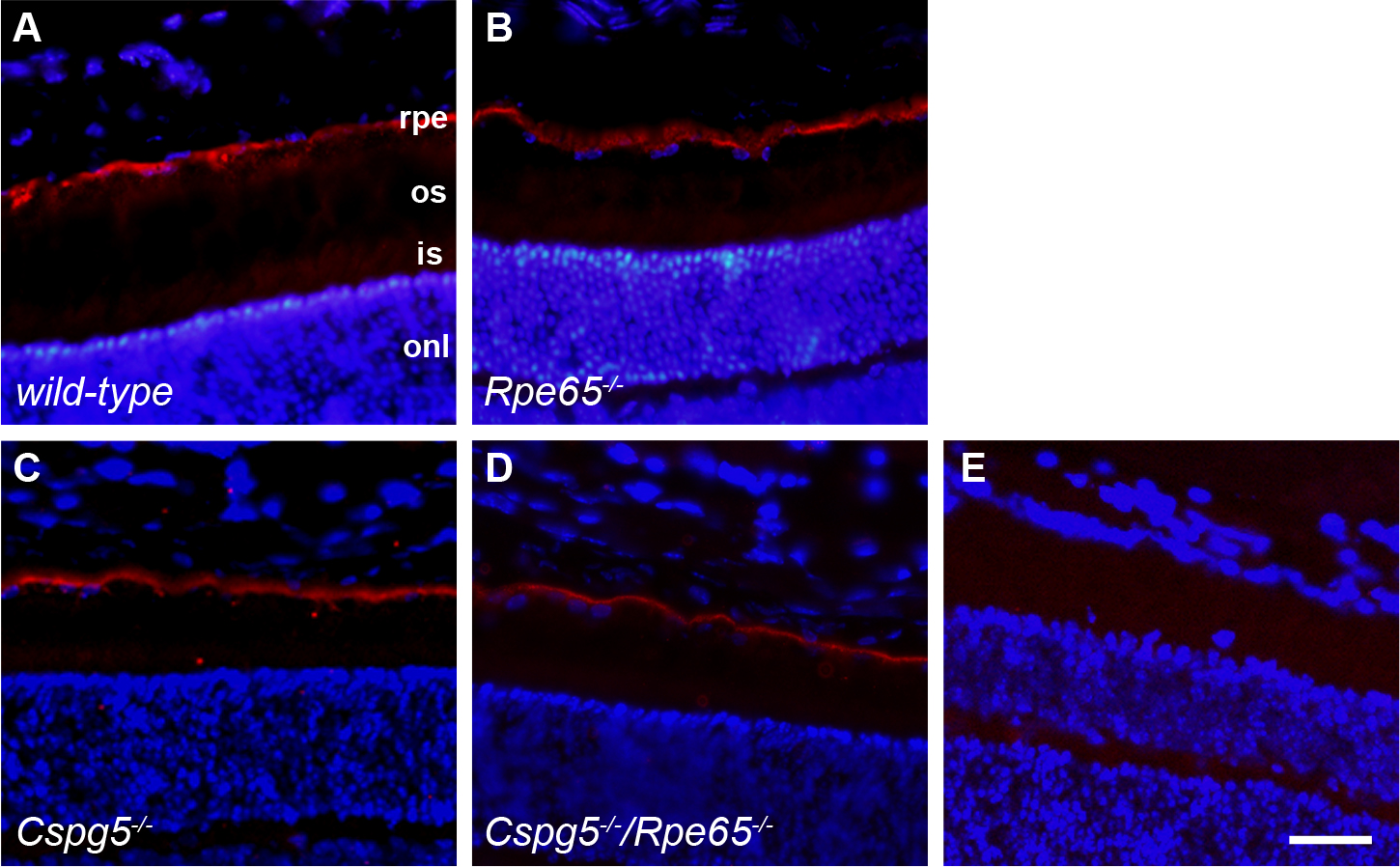 raised against the C-terminus of Stra6 (red), on retinal sections of wild-type (A), Rpe65−/− (B), Cspg5−/−, and (C) Cspg5−/−/Rpe65−/− (D) mice. Stra6 was predominantly expressed at the basolateral membrane of the retinal pigment epithelium (RPE) in all analyzed