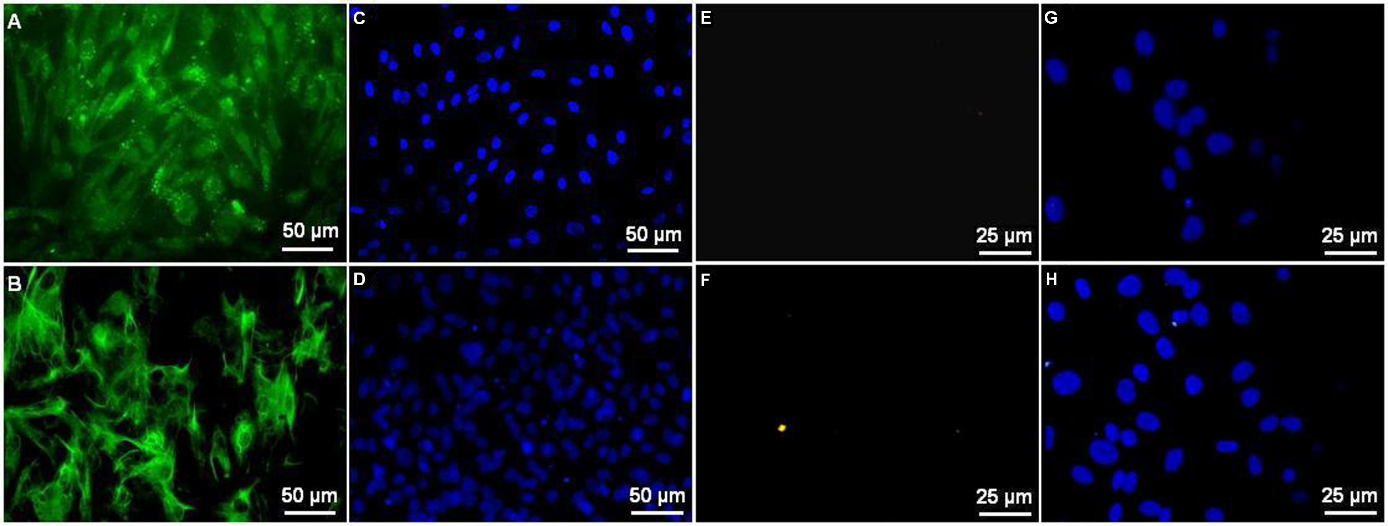 cells. C: The nuclei of RPE cells in (A) were stained with : 4´,6-diamidino-2- phenylindole dihydrochloride (DAPI). B: The RPE cells were immunostained for cytokeratin 8/18, confirming the epithelial identity of the isolated cells. D: The nuclei of RPE cells in (B) were stained with DAPI. E,F: As negative controls, RPE cultures were simultaneously immunostained without using primary antibodies. G,H: The DAPI-stained nuclei of RPE cells in control cultures.