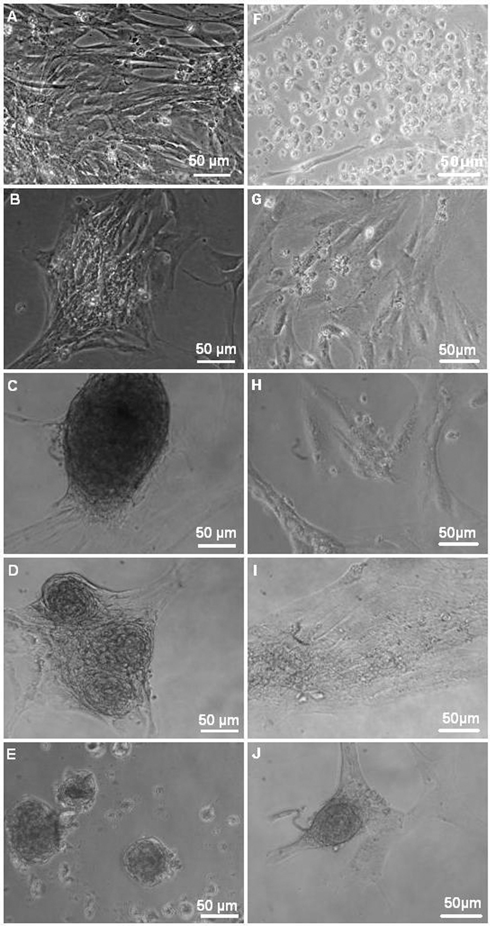 over 30 days. A: HAF-treated RPE culture after 3 days. The cells grew as a monolayer and were arranged in parallel to each other. B: After 7 days, the cells began to form cell clusters. C, D: The RPE-derived neurosphere-like colonies formed and increased in number during the 2nd and 3rd weeks. E: Consequently, the RPE-derived colonies detached from the base of the plate and floated into the medium. F, G, H, I, J: The control cultures (RPE cells cultured in Dulbecco's modified Eagle medium: Nutrient mixture F-12 [DMEM/F12]) had a considerable