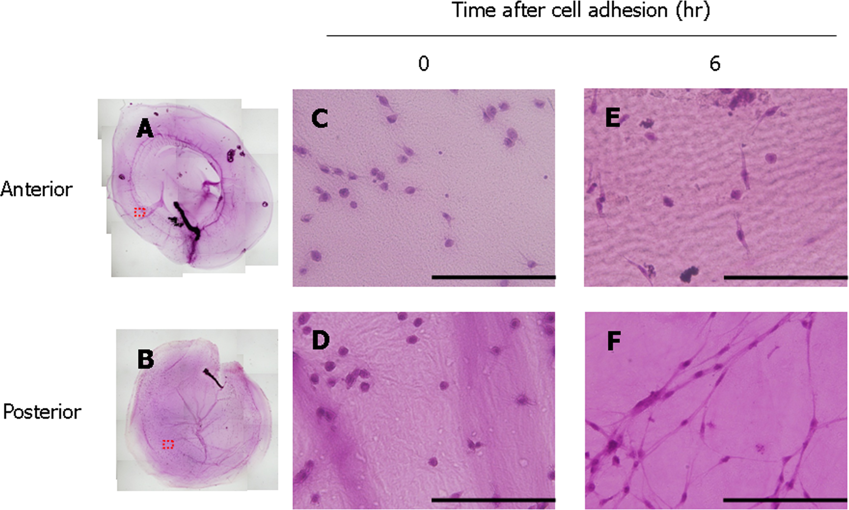 indicated periods. The micrograph depicts cell morphology on the vitreous surface at the anterior (A) or the posterior region (B) and the magnified image is shown in (C) or (D), respectively. The magnified image (E or F) is the cell morphology on the vitreous surface at the anterior or the posterior region, respectively, at 6 h after cell