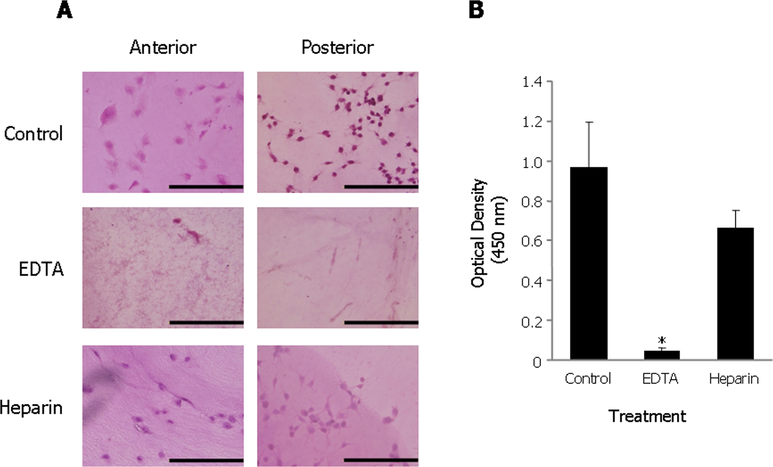 Figure 6. Effect of EDTA and heparin on cell adhesion of retinal Müller cells. A: EDTA (EDTA) or EDTA (5 mM) or heparin (10 μg/ml) was preincubated with human retinal Müller cell line (MIO-M1) cell suspension