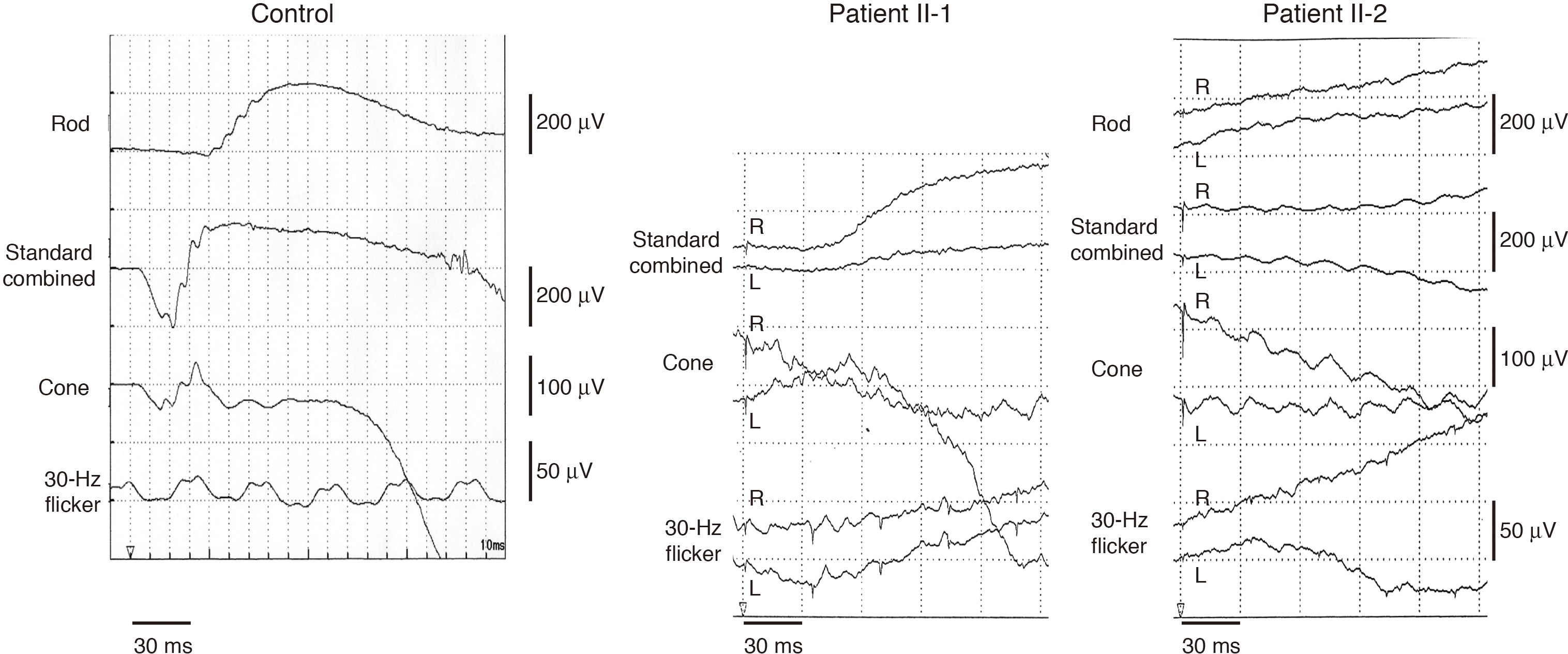 Figure 2. Full-field electroretinogram. The electroretinograms (ERGs; patient II-1) at the age of 9 years, showing no standard combined,