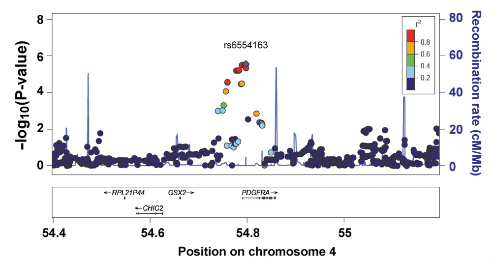 Genomic region plot from the Avon Longitudinal Study of Parents and Children genome-wide association study for corneal curvature.