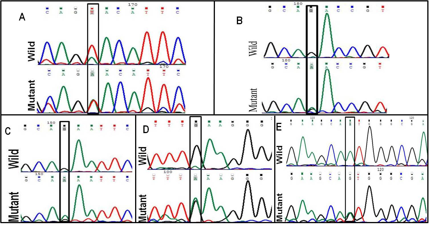 Figure 1. Deoxyribonucleic acid sequence electropherogram of pathogenic variations. (A) crsytallin beta a4, CRYBA4:p.Y67N (T>A), (B) crystalline beta b1, CRYBB1:p.D85N (G>A), (C) CRYBB1:p.E75K (G>A), (D) CRYBB1:p.E155K (A>G), and (E) gap function protein, alpha 3, GJA3:p.M1V (A>G).