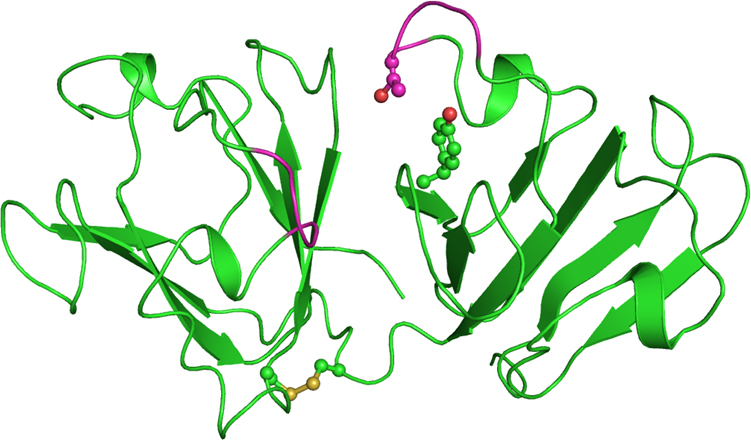 Figure 2. Cartoon representation of the model structure of the wild-type crystallin beta-A4 protein. The disulfide bridge and residues