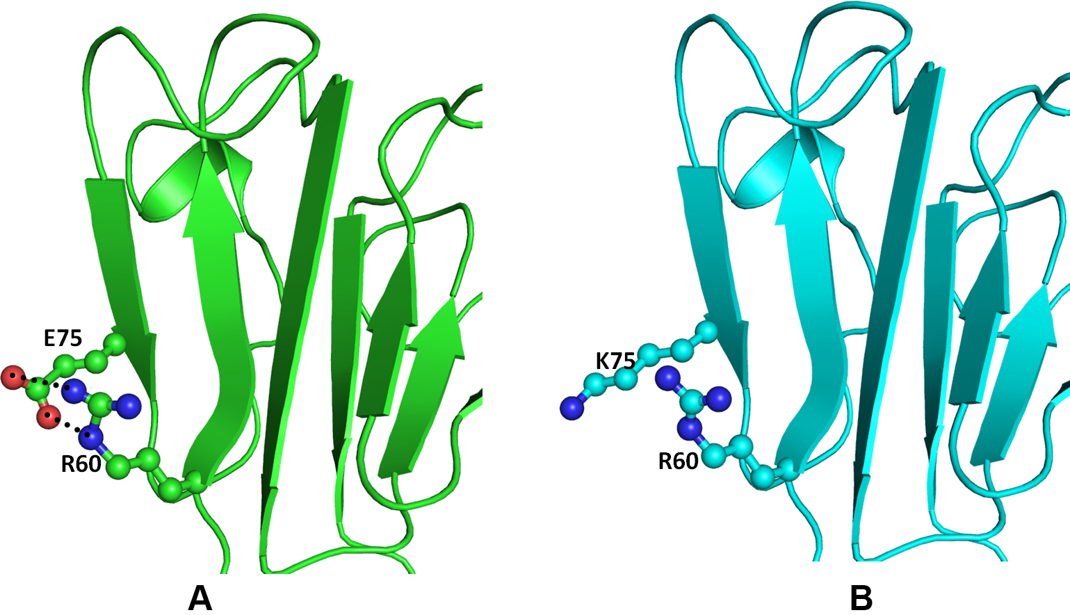Figure 6. Model structure representation of the wild and mutant (Glu75Lys) proteins. A: Beta crystallin B1 (CRYBB1) protein showing the important residues (balls and sticks) and the hydrogen bonds (black dotted lines). B: The contacts are lost in the mutant.