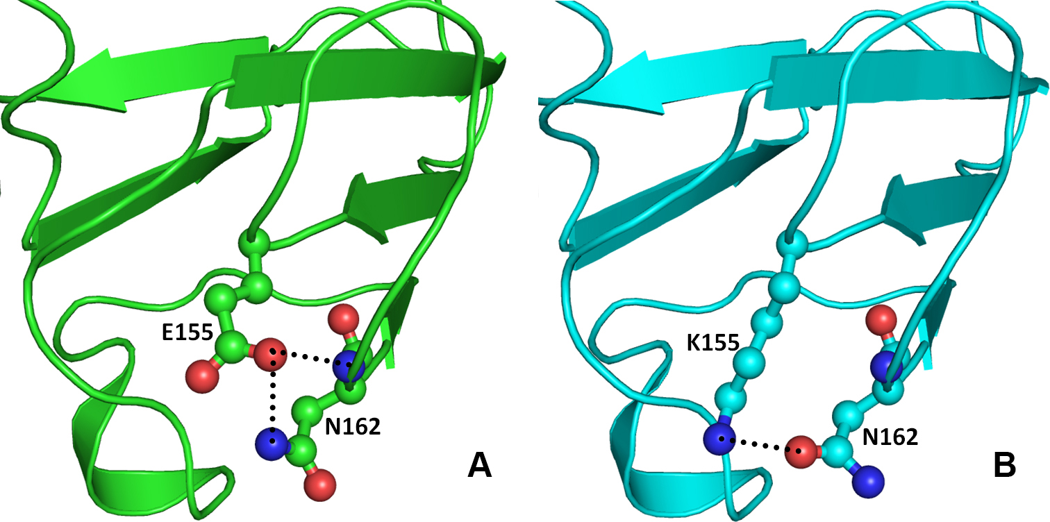 Figure 8. Model structure representation of the wild and mutant (Glu155Lys) proteins. A: Glu155 forms two hydrogen bonds, one with side chain amide nitrogen and another with main chain nitrogen of Asn162 which