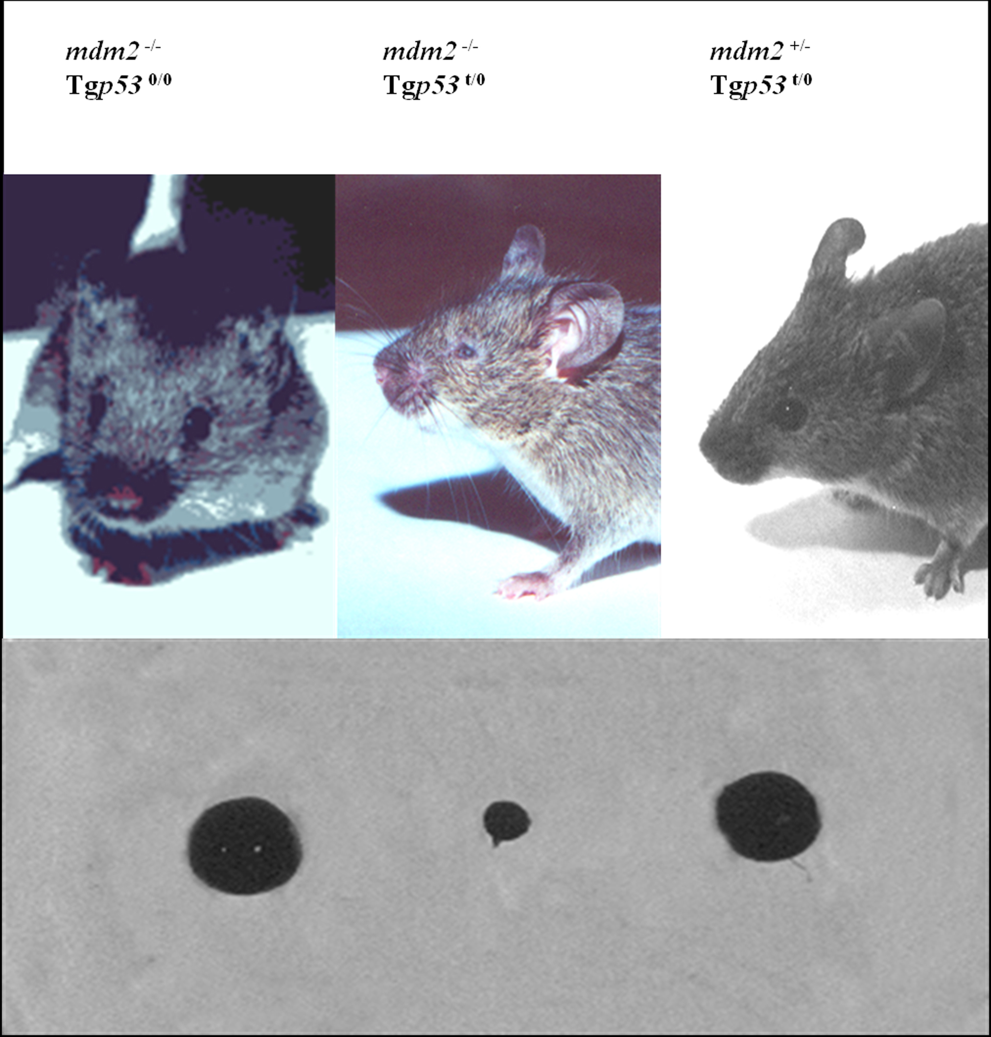 mutation at the p53 E3 ubiquitin protein ligase homolog (Mdm2) locus (mdm2−/−/Tgp530/0) show a normal eye size. In contrast, the mdm2−/−/Tgp53t/0 mice have microphthalmia and closed eyelids. Microphthalmia is rescued by the concomitant presence of an Mdm2 allele (mdm2+/−/Tgp53t/0). For comparison, the enucleated eyes are shown in the bottom panel.