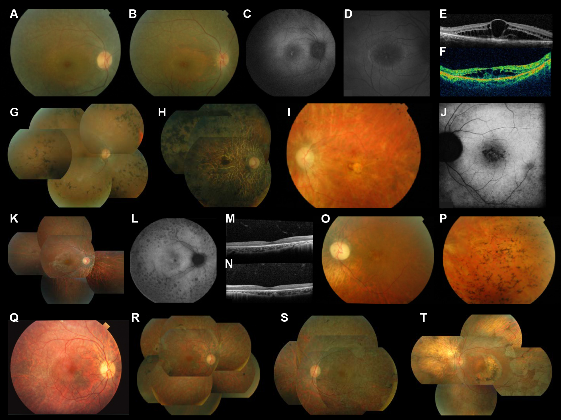 showing the macula (O) and the temporal periphery (P). Q-T: Families RP517 (Q-S) and RP1682 (T) with RLBP1 mutations; fundus photographs of the right eye at 32 years (Q) and 40 years (R) and of the left