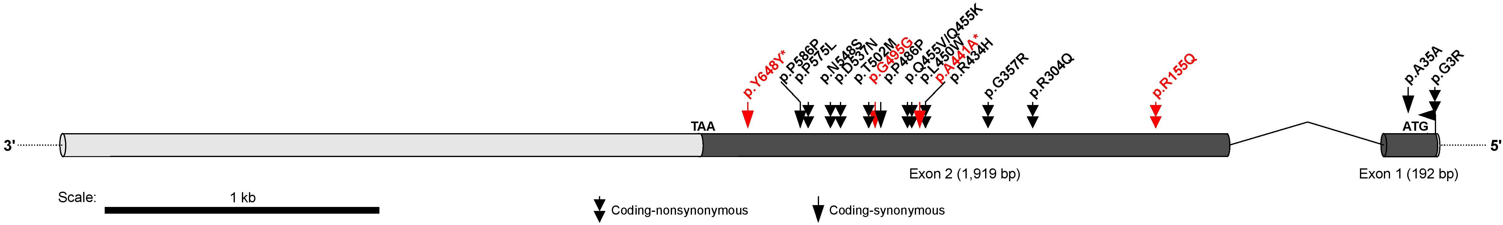 FECD in this report (red font). Variants are indicated with double-headed arrows: black arrows indicate coding-nonsynonymous