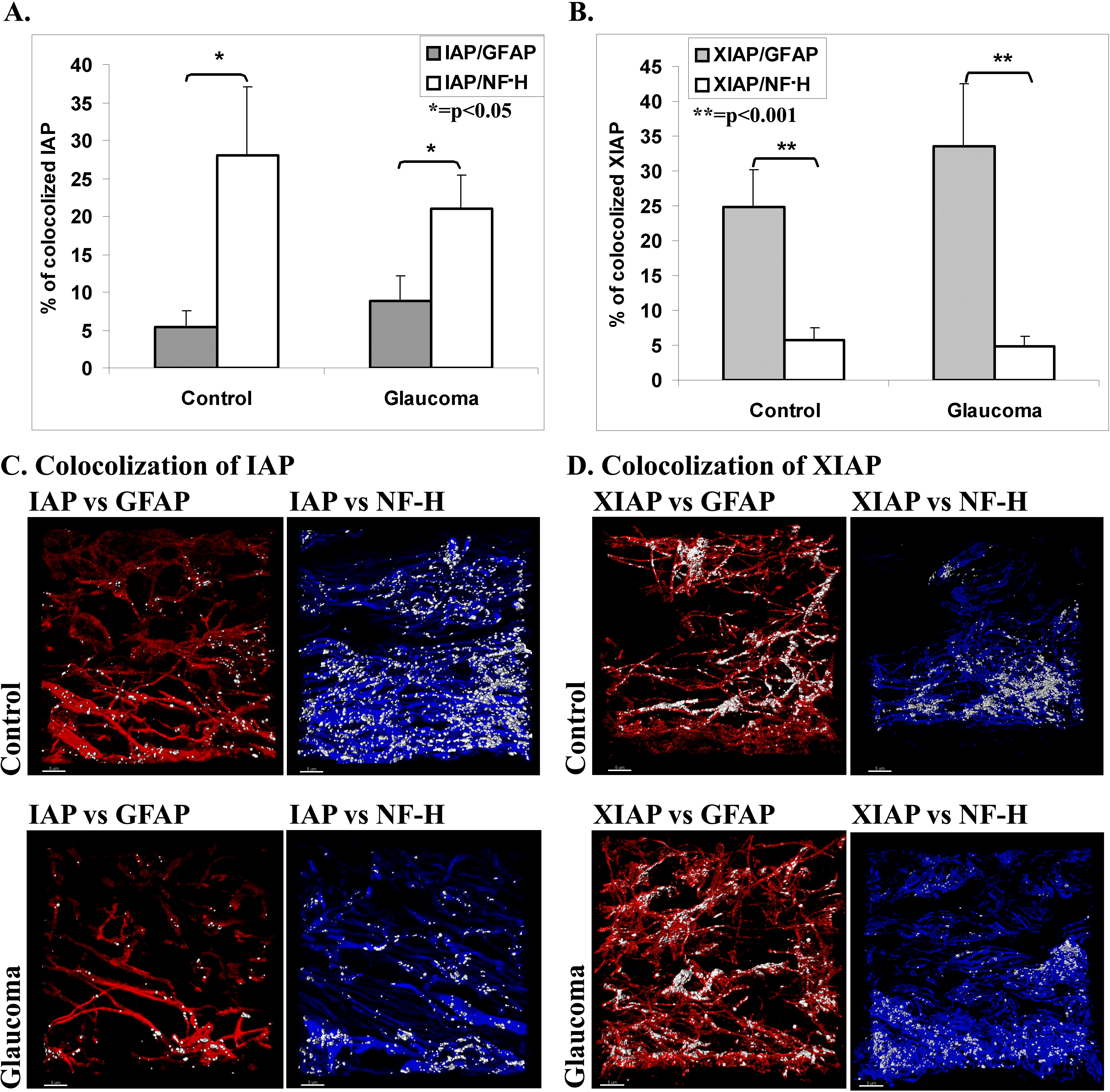 the induction of elevated intraocular protein (IOP). A: Colocalization of IAP-1 with NFH and GFAP suggests that IAP-1 in the ON is mostly neuronal. B: Colocalization of XIAP with NFH and GFAP suggests that XIAP in the ON is mostly glial. C, D: These images represent colocalization of IAP-1 and XIAP with NFH and GFAP (white areas). The analysis was done after the