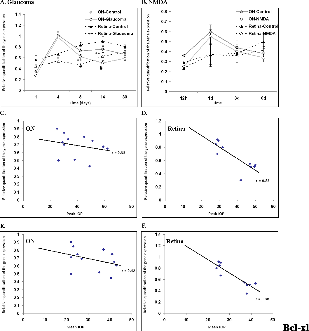 Figure 8. Real-time polymerase chain reaction analysis of the prosurvival gene, Bcl-xl, from optic nerves and retinas of glaucoma (A) and NMDA retinal toxicity (B) models. Bcl-xl gene expression decreased significantly in both the optic nerves (ONs) and retinas of glaucomatous eyes,