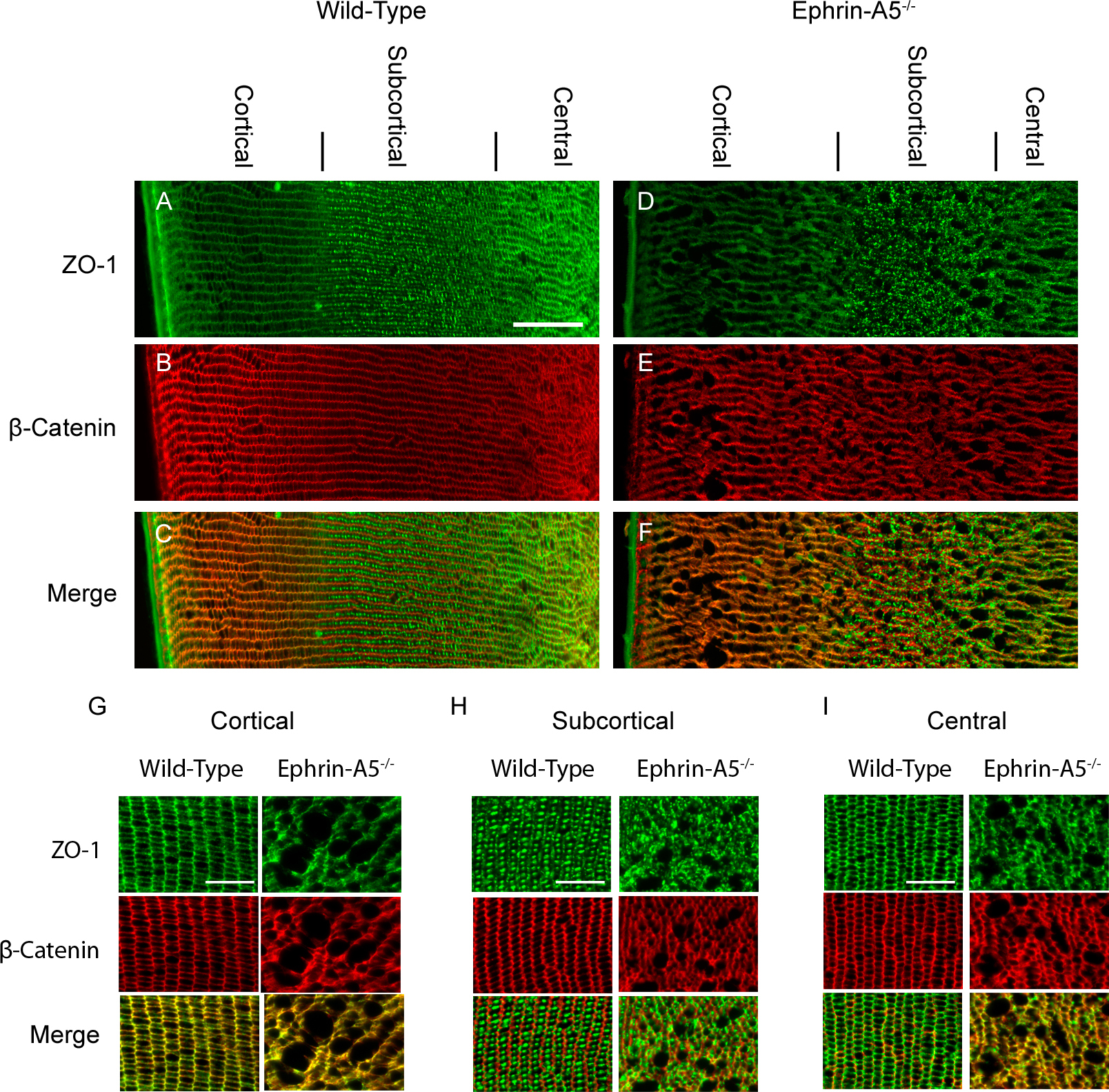 in the ephrin-A5-/- lens. Scale bar = 100 μm. G-I: Disorganization of the fiber cells in the ephrin-A5-/- lens are observed in all fiber cell regions, including the cortical (G), subcortical (H), and central (I) areas. Scale bar=50 μm.