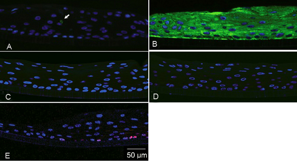 Figure 1. Immunohistochemical examinations of the cultivated human conjunctival epithelia (CjE) equivalent. The cultivated human CjE