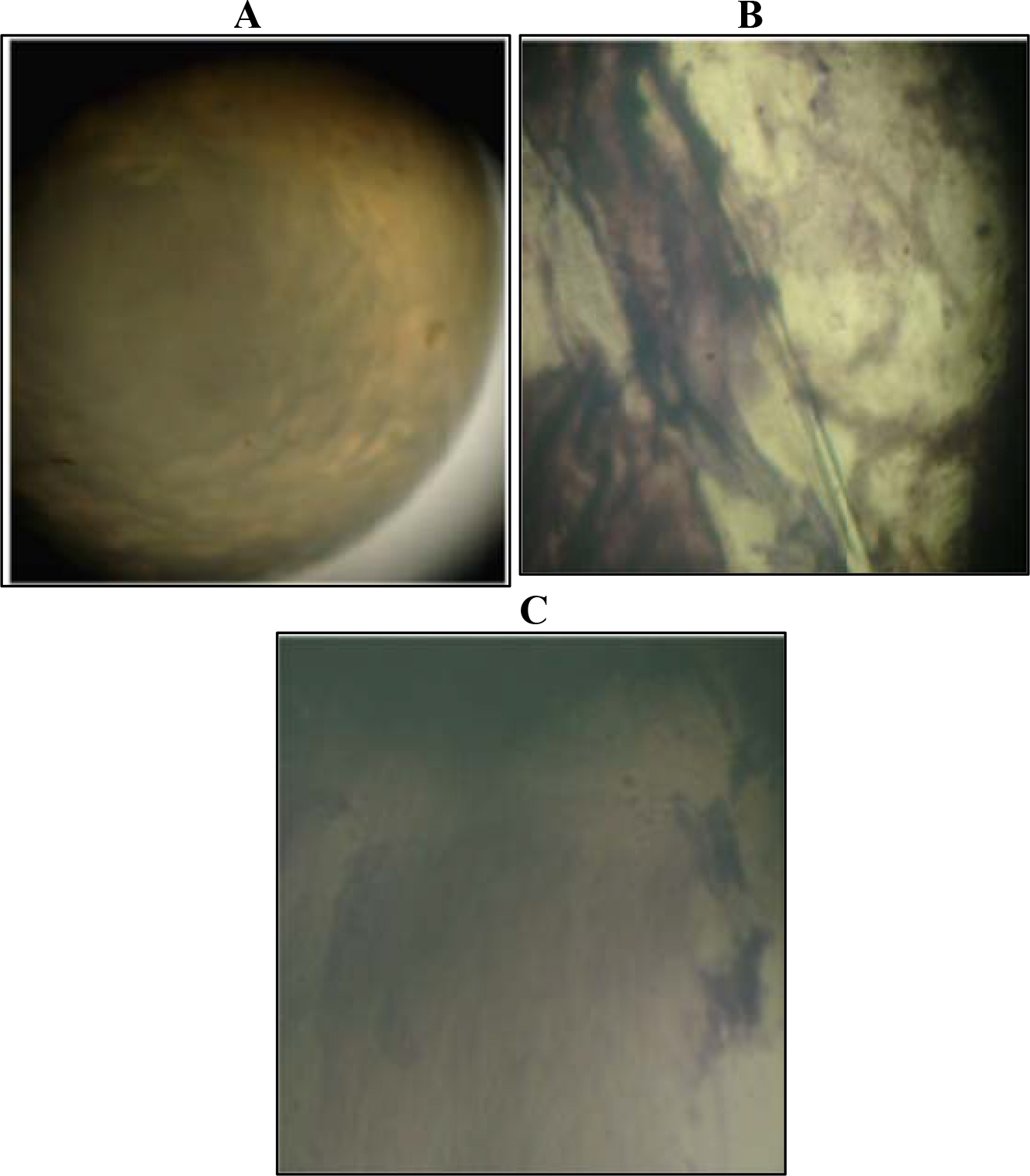 Figure 1. Results of nitroblue tetrazolium (NBT) salt reduction assay in the ocular lens of Wistar rat pups. A: No blue color formation was observed upon incubation with NBT for 45 min in Group I rat lenses. B: Formation of intensely blue-colored formazan deposits, suggestive of superoxide (O2 −) generation was observed in Group II rat lenses. C: Negligible blue formazan deposition was observed in Group III rat lenses.