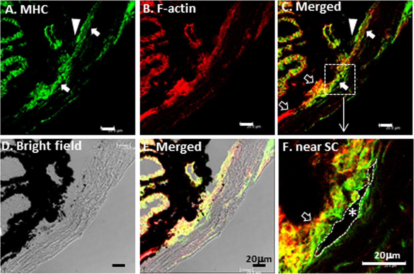 the CM (opened arrows), especially posteriorly. B: Positive F-actin labeling (red) was seen in ciliary processes, CM and TM. C: Patchy co-localization of MHC and F-actin was seen in TM cellular layers. D: Bright field for tissue orientation. E: Merged bright field and fluorescence images provide detailed structural orientation. F: Magnified image of dotted square of C showed co-localization of MHC and F-actin in CM. In the TM, adjacent to SC (dotted outline with asterisk*), MHC and F-actin