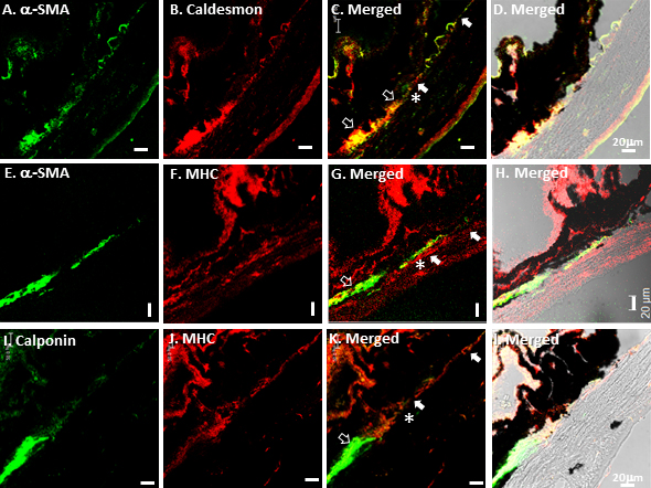 to SC (asterisk *). I-L: calponin was mainly localized in CM (opened arrow, green), while MHC was mainly localized in the TM (closed arrows) adjacent