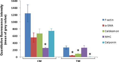 for calponin. TM mean fluorescence intensities of α-SMA, caldesmon and calponin were less than that of F-actin and MHC (p=0.0006).