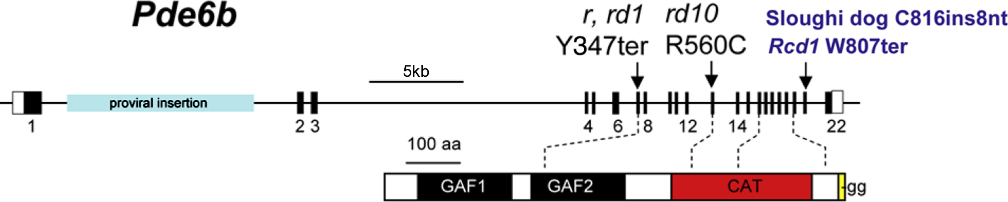 Figure 1. Schematic representation of the mouse PDE6B gene and protein, and the localization of spontaneous mutations in animal models.
