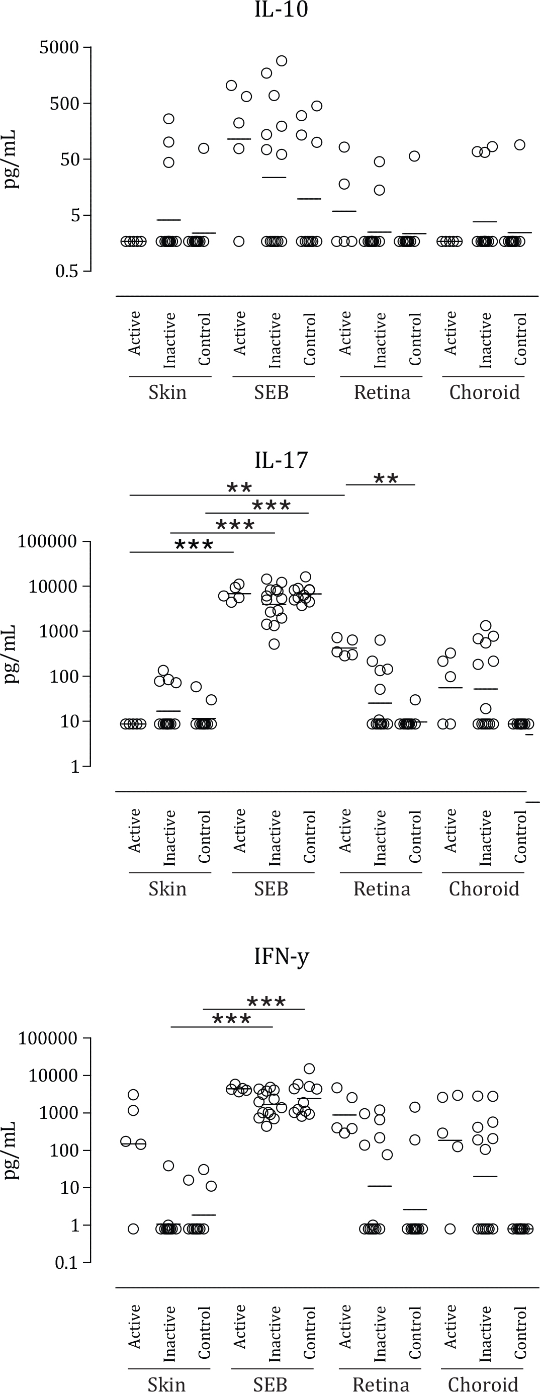 Figure 1. Scatterplots showing the levels of interleukin (IL)-10, IL-17, and interferon (IFN)-γ in supernatant (pg/ml) of peripheral