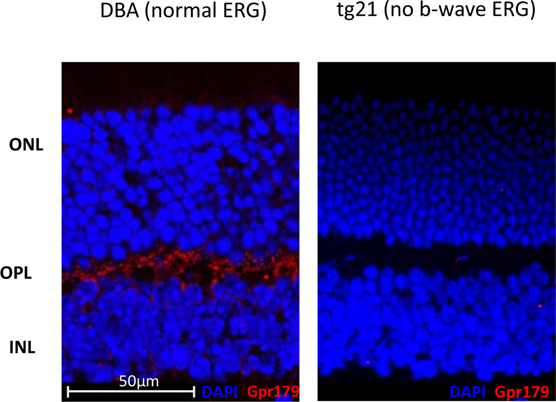 Figure 7. Retinal cross-sections obtained from tg21 mice no b-wave mice and control littermates were stained for GPR179. Positive staining