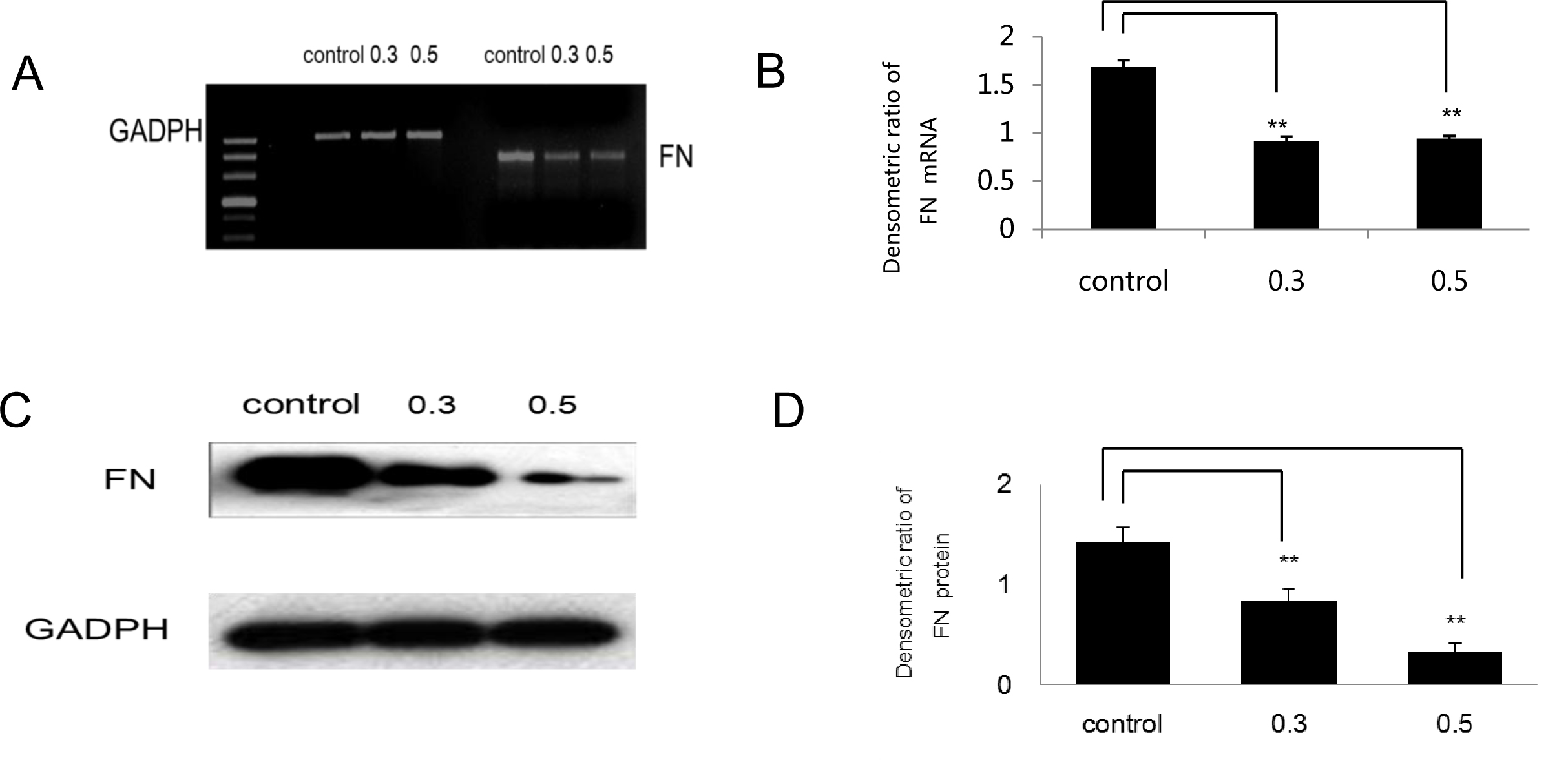 were reproducible. A and C: The expression of fibronectin (FN) were assayed using reverse transcriptase (RT)–PCR and western blot analyses. B and D: Compared with cells cultured in the complete medium, the densitometric ratios of FN mRNA and protein (normalized to GADPH)
