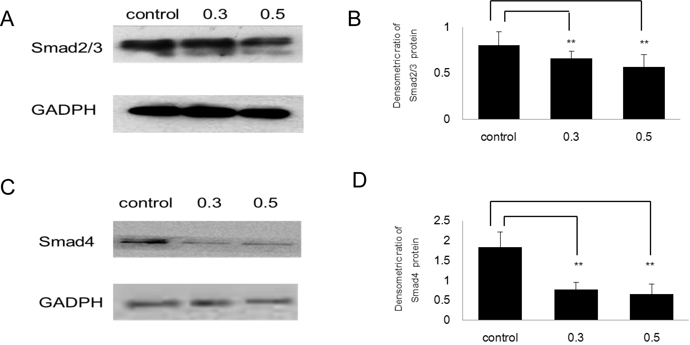 (RPE) cells were treated in the complete medium (control) or 0.3 mg/ml or 0.5 mg/ml PFD for 24 h. A and C: The protein expression of Smad2/3 and Smad4 were investigated using immunoblot analysis. B and D: Densitometry ratio data are presented. The densitometric ratio is the protein of interest band density divided by the glyceraldehyde-3-phosphate