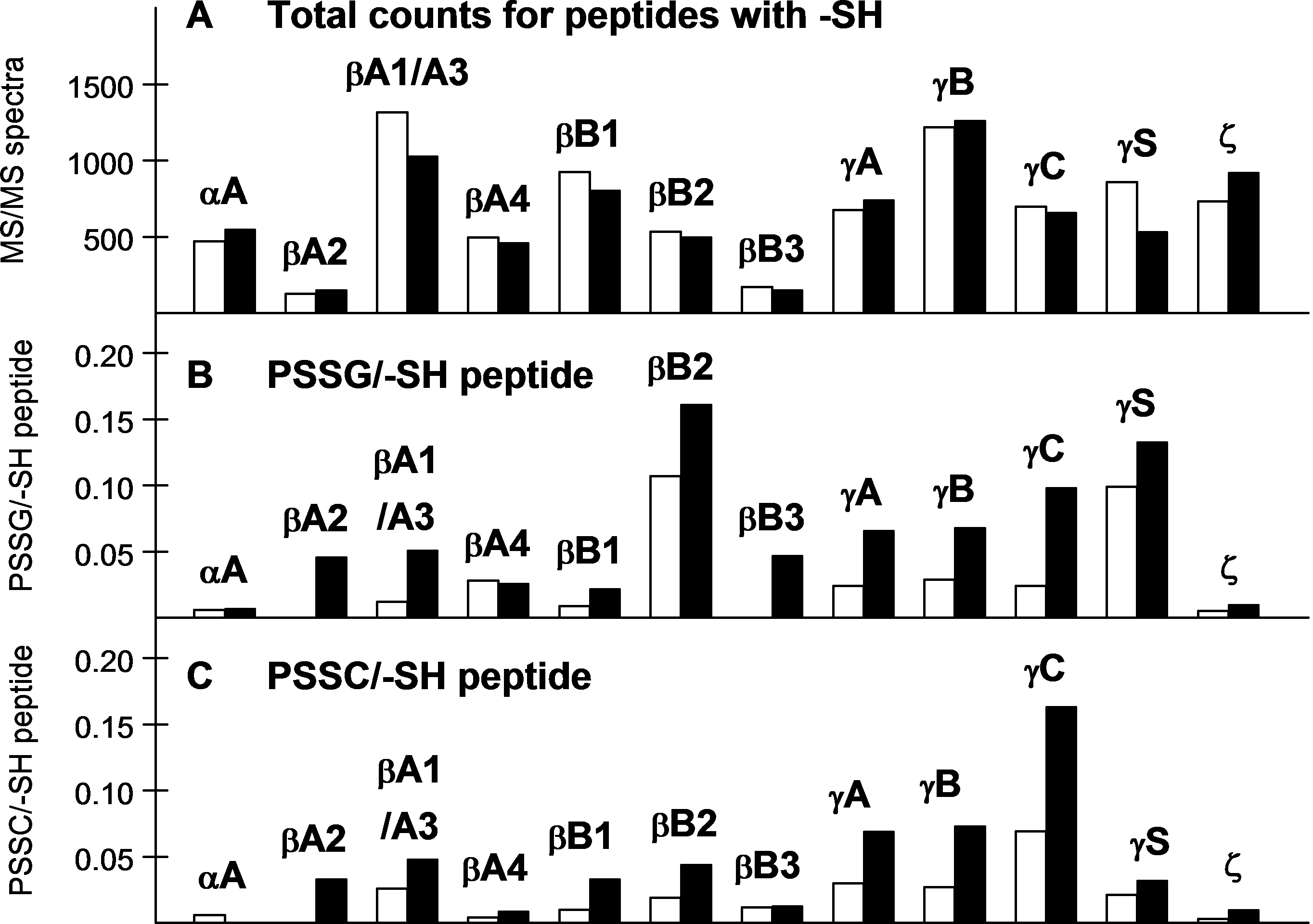 A shows total counts for peptides containing an -SH group; B shows peptides containing protein-bound glutathione (PSSG) expressed as per -SH peptide; and C shows peptides containing protein-bound cysteine (PSSC) expressed as per -SH peptide. Open bars are counts from age-matched