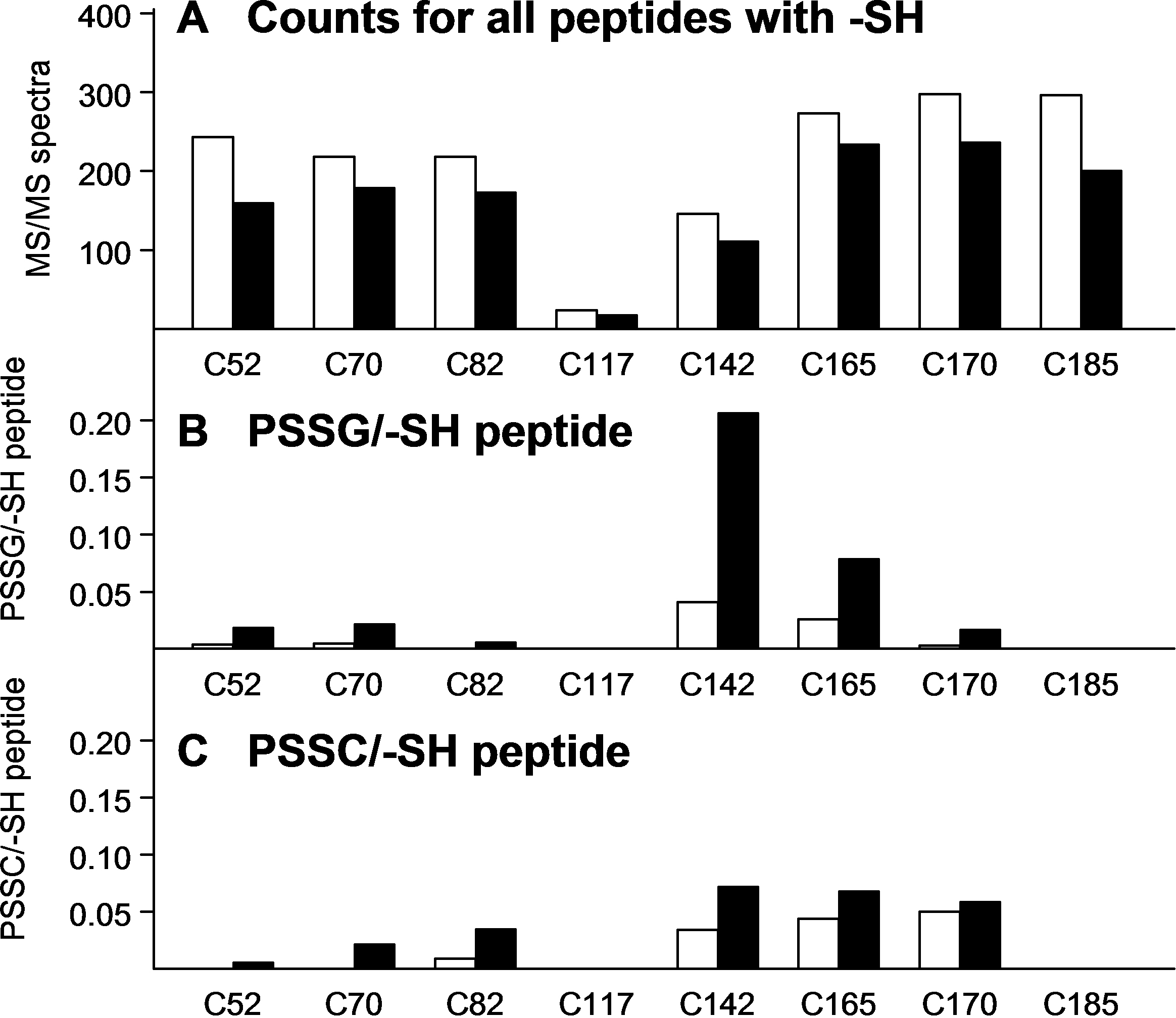 scale for A, compared to those for B and C, which are identical. The counts in A correspond to a soluble protein sample of 0.4 mg. Peptides for each of the 8 cysteine residues in panel A showed an O2-induced decrease in number of counts. A relatively low number of counts were detected for the C117 control and O2-treated peptides. The majority of O2-induced PSSG (B), and to a lesser extent PSSC (C), was shown by residues C142 and C165.