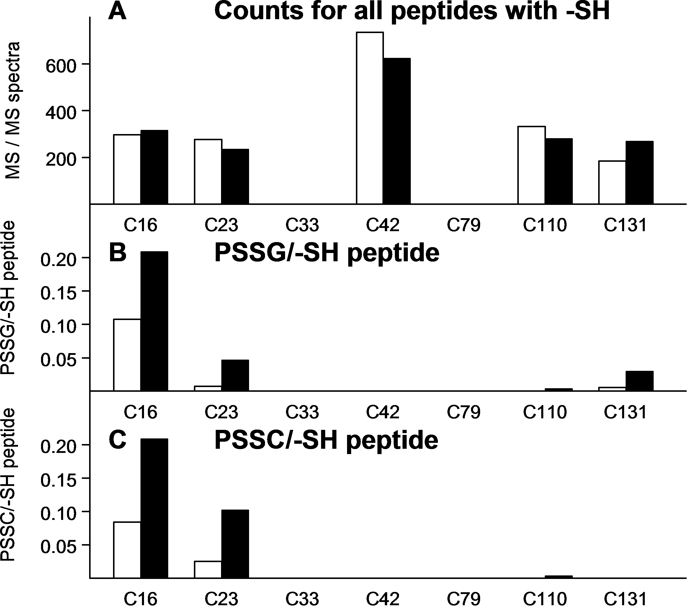 A shows total counts for each of the 7 peptides containing an −SH group; B shows peptides containing protein-bound glutathione (PSSG) expressed as per −SH peptide; and C shows peptides containing protein-bound cysteine (PSSC) expressed as per −SH peptide. Open bars are counts from age-matched