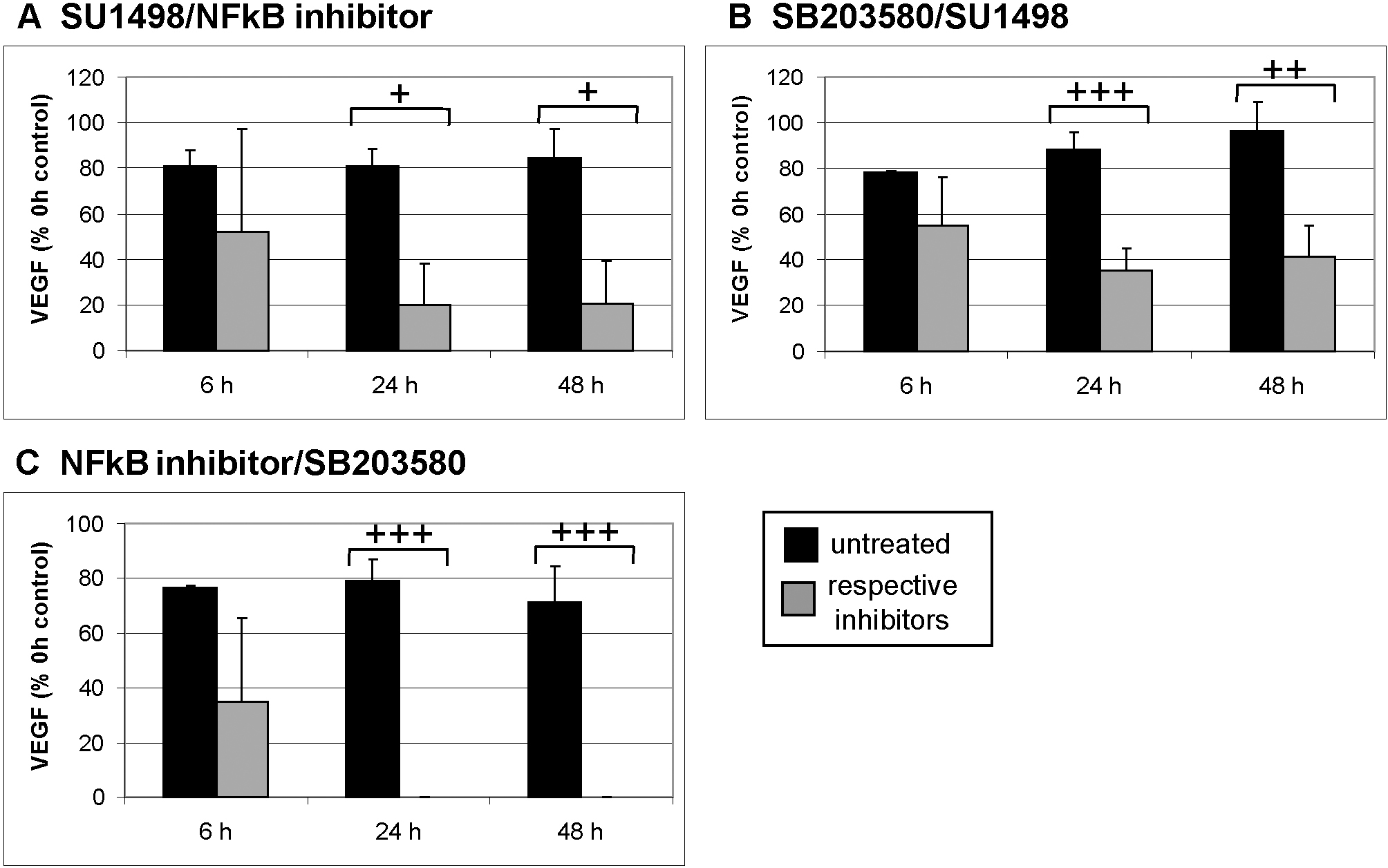 to five independent experiments. Absolute concentration of VEGF at 0 h was 67.08 ±24.08 pg/ml for SB203580 + the NFkB inhibitor,