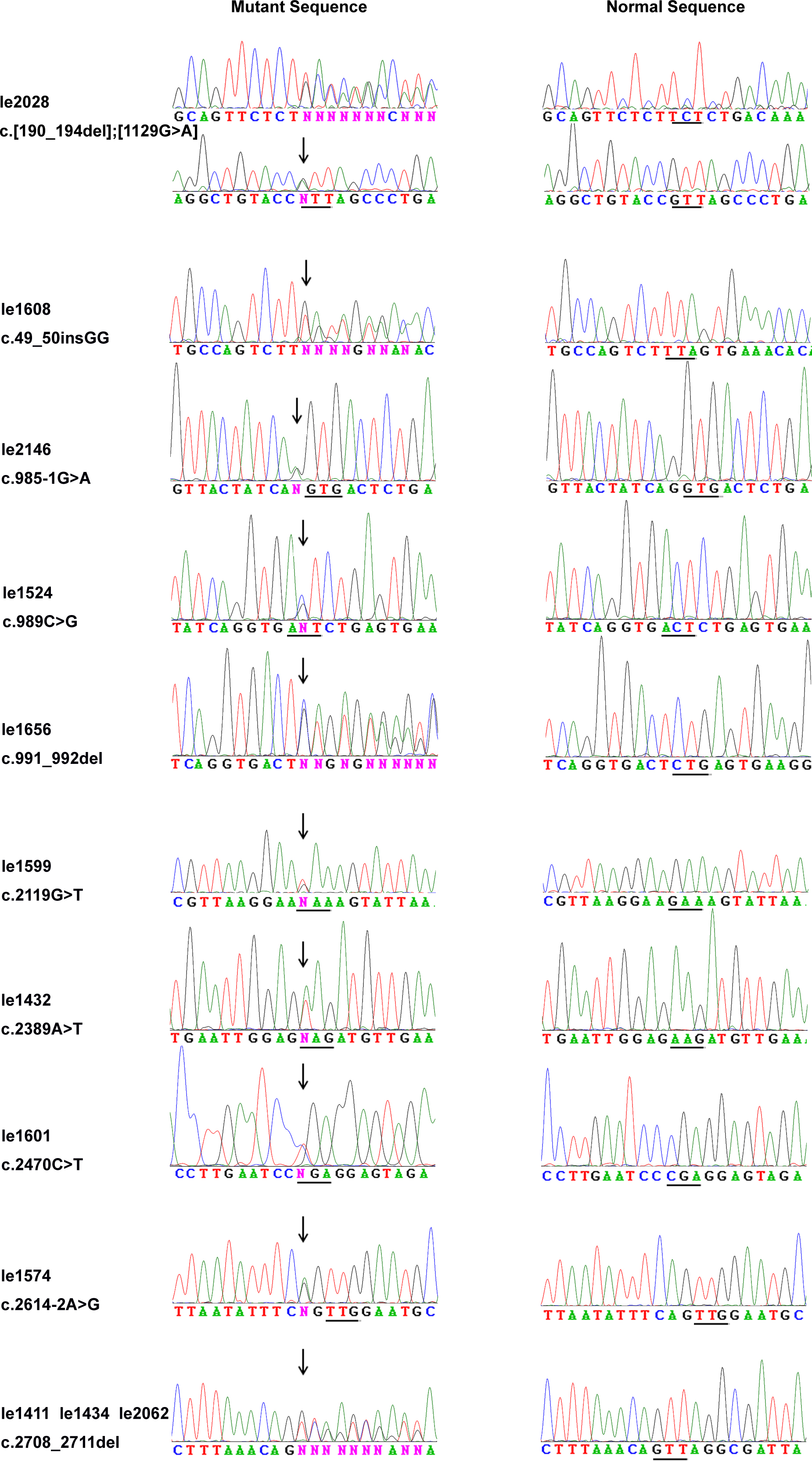 compared with corresponding normal sequences (right column). The mutational sites are indicated with an arrow, and the amino