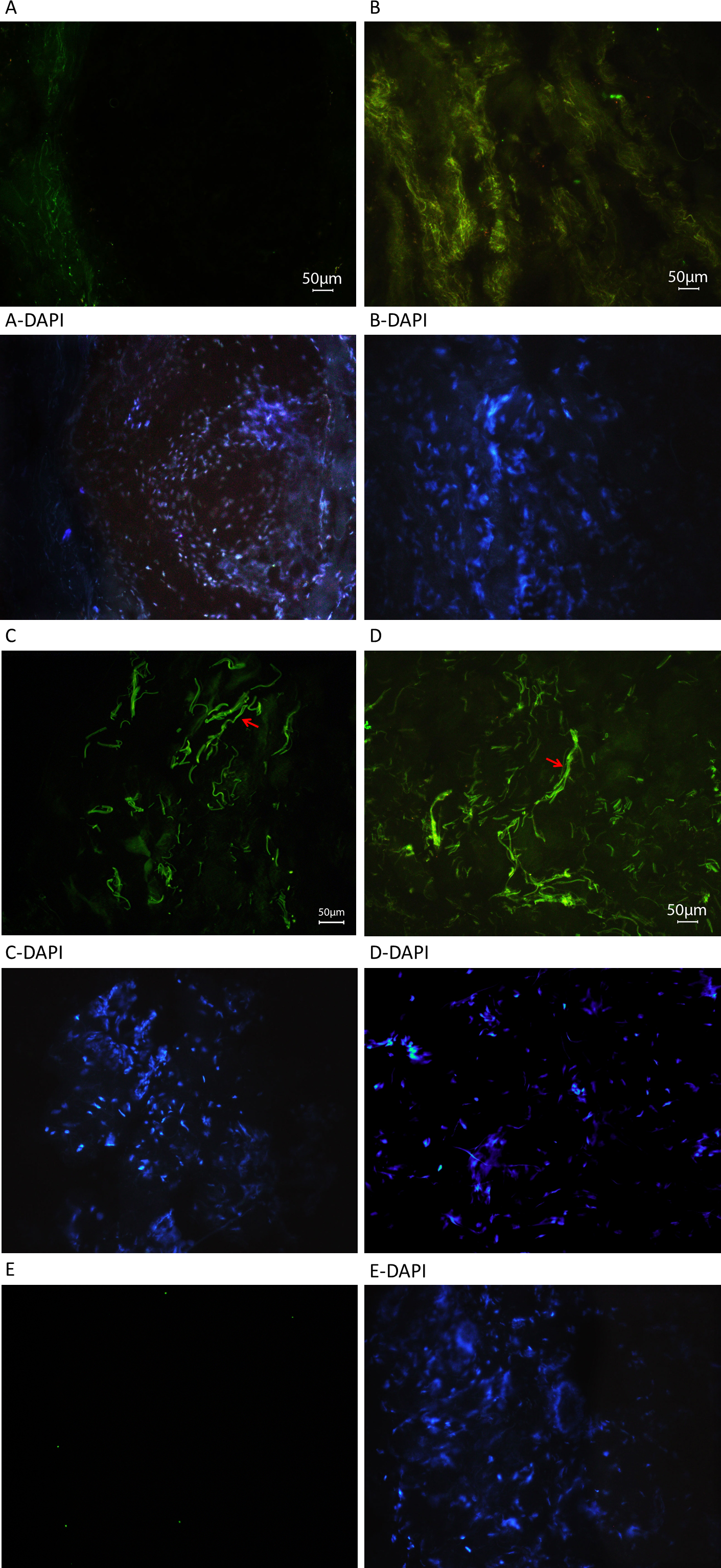 primary congenital glaucoma (PCG; A) and the control individual (C), and a heterozygous carrier with pseudoexfoliation (PEX) syndrome (B) and the control individual (D). The thick and long fibers that stained for fibrillin-1 in the control individuals (C, D; arrows) were not observed in multiple sections derived from the patient tissues (A, B). Fibers in the patient with PEX syndrome are dense and convoluted (B) compared to the control individuals (D). Negative control is shown in E.