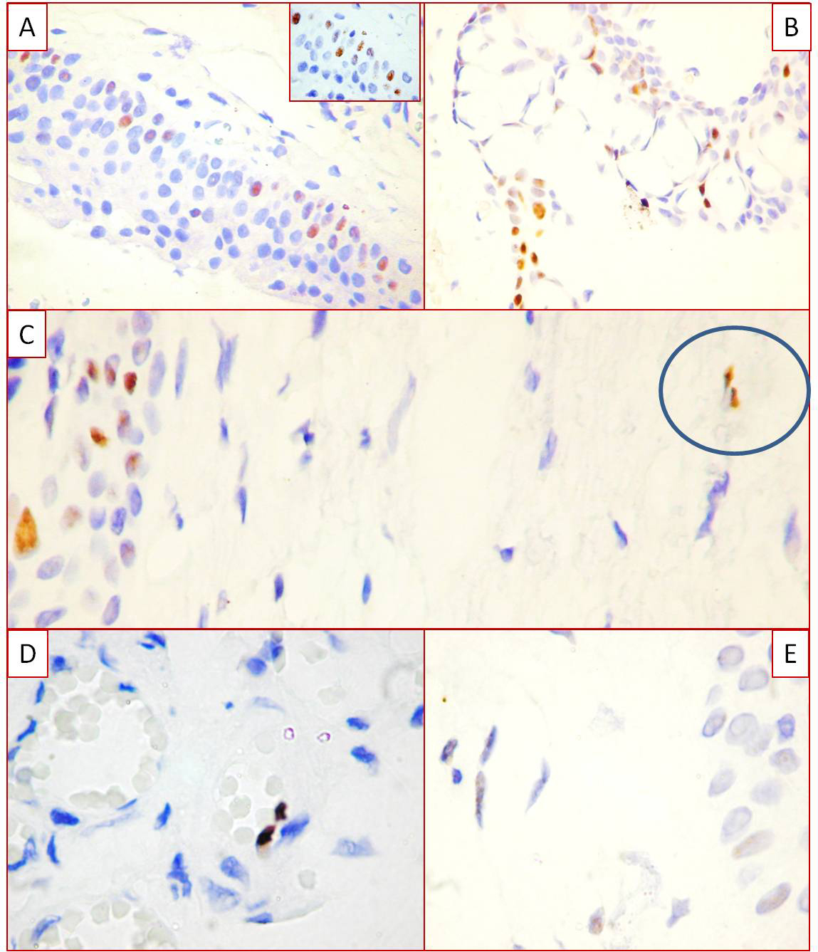 Figure 4. P53 expression in human pterygium. Basal and parabasal distribution of p53 positive cells in the human pterygium (A, B). Scattered positive p53 positive fibroblast-like cells in fibrovascular compartment of human pterygium (C). Note the discrepancies between the higher density of the p53 positive cells in the basal layer of the epithelial compartment