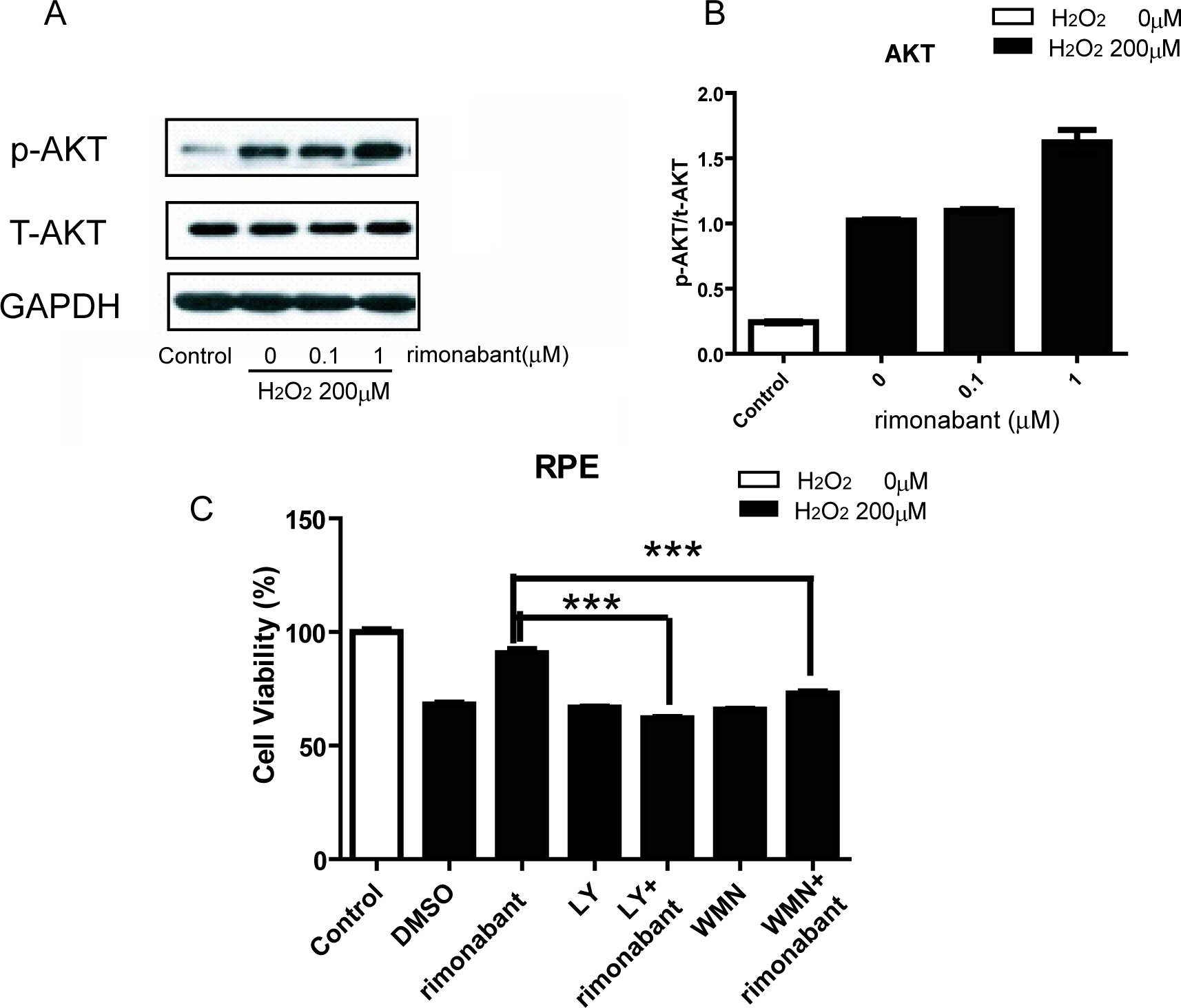 Figure 5. Rimonabant modulates phosphorylation of the PI3K/Akt signaling pathway. A: Representative western blot analysis shows that rimonabant (1 μM) enhanced the H2O2-induced activation of p-PI3K/Akt in RPE cells. RPE cells were pretreated with rimonabant (0.1, 1 μM, 15 min) and then exposed