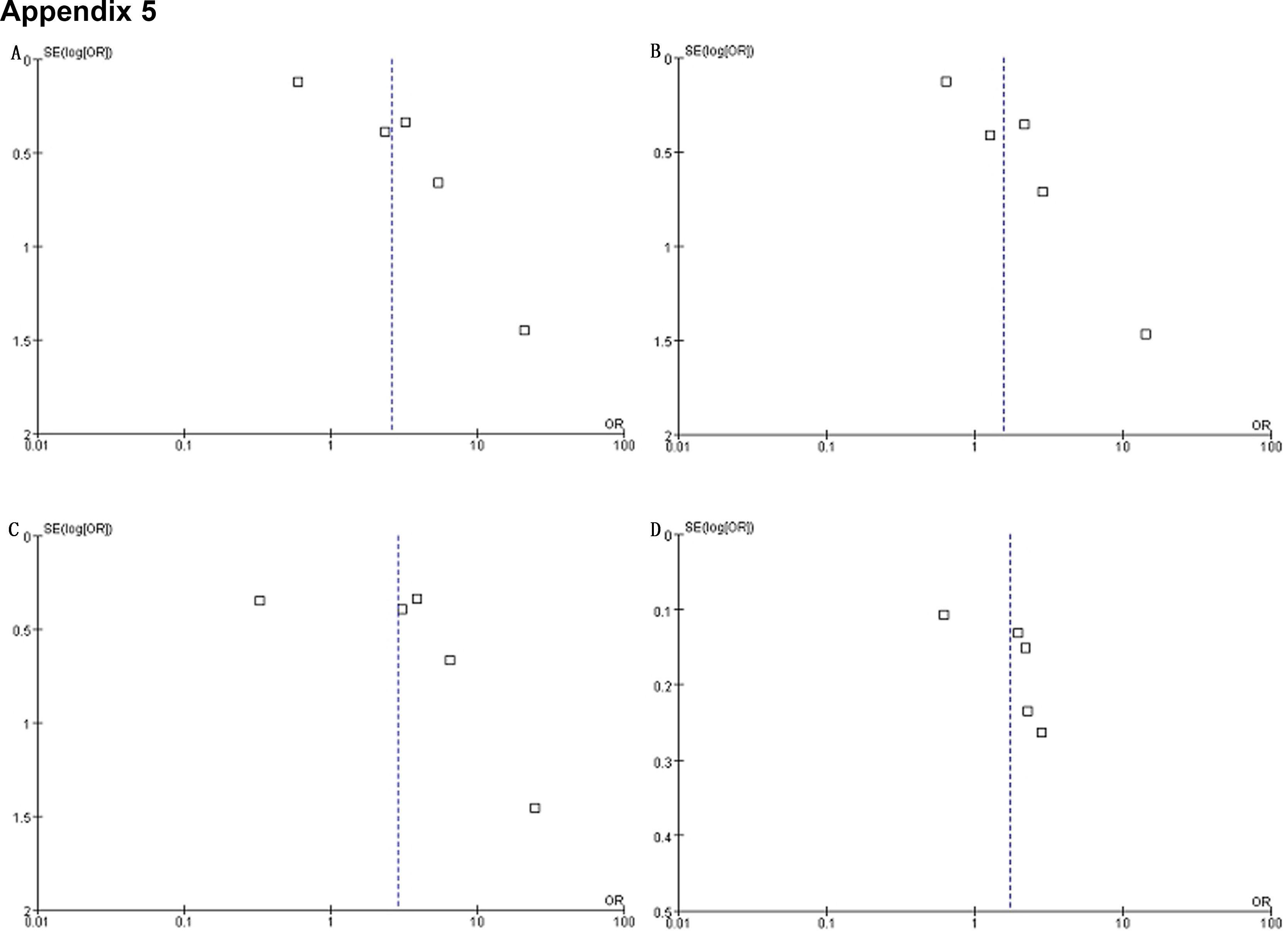 To access the data, click or select the words “Appendix 5.” The results of the funnel plots in all comparisons in Caucasion populations. A was in comparison of “GG+GA vs AA”; B was in comparison of “GA vs AA”; C was in comparison “GG vs AA”; and D was in comparison “G vs A”.