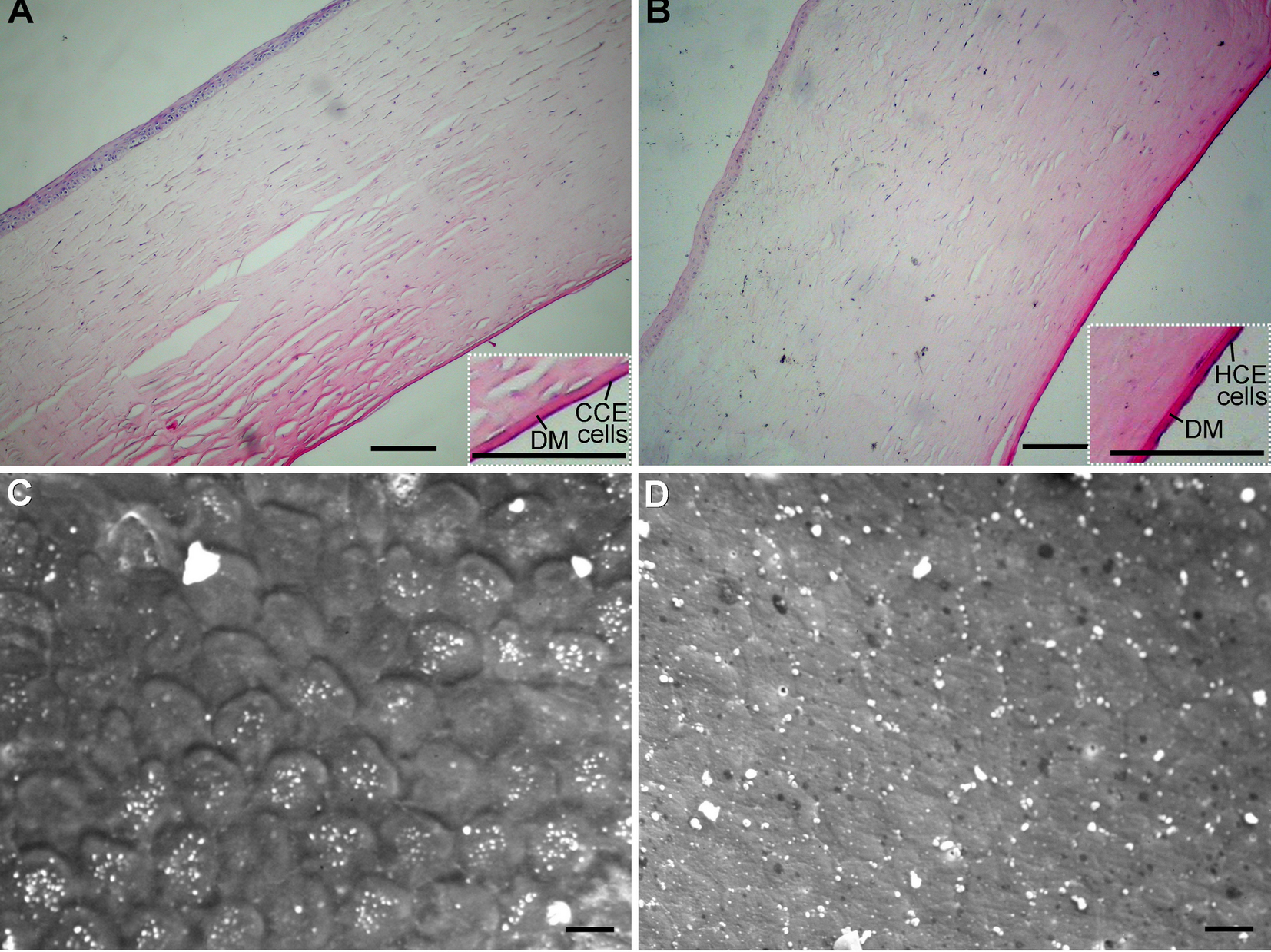 (H&E) staining in tissue-engineered human corneal endothelium (TE-HCE) eye A and normal control eye B SEM in TE-HCE eye C and normal control eye D are shown. Scale bars A, B 100 μm; C, D 10 μm.