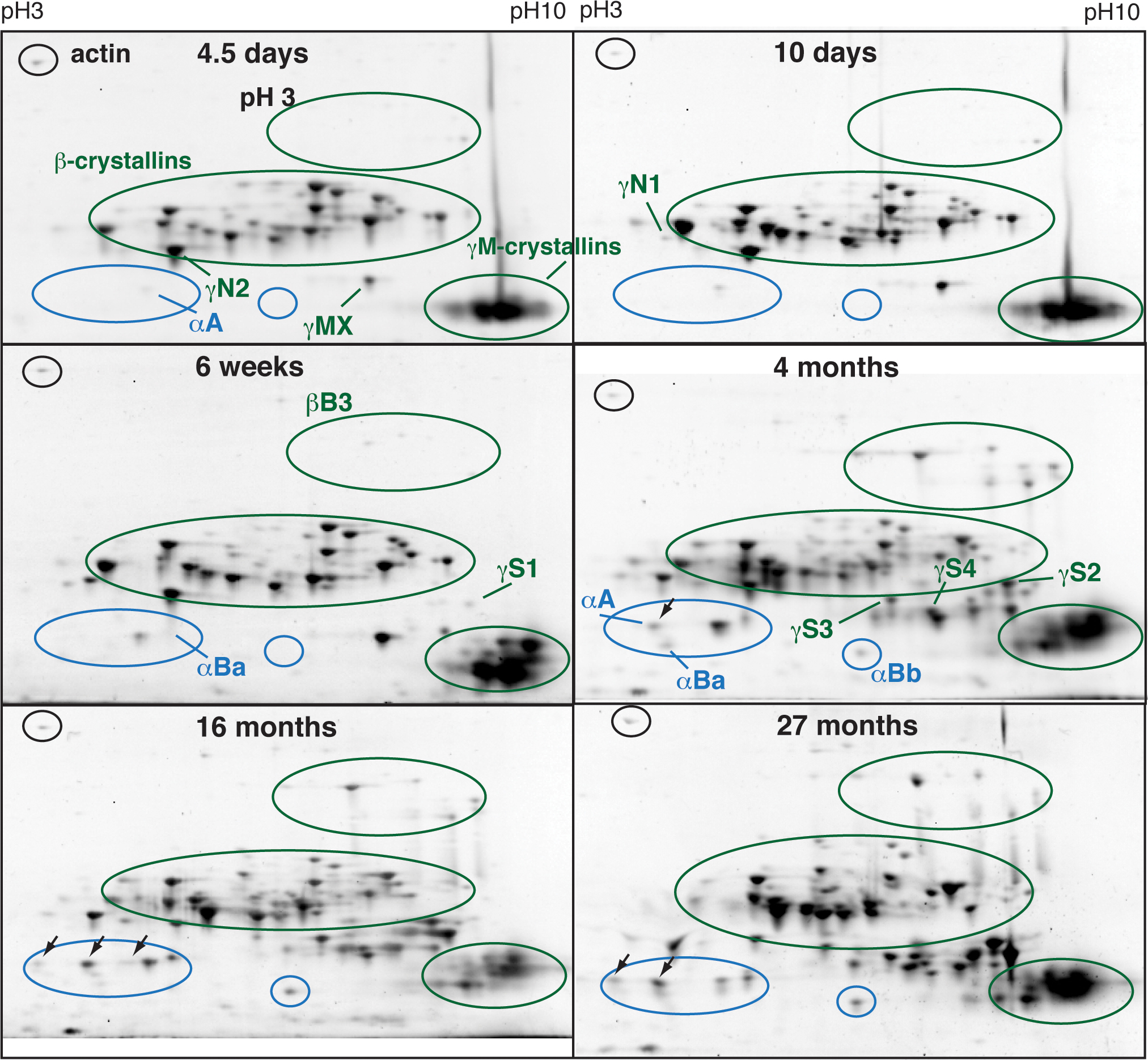 performed on 11 cm pH gradient 3–10 nonlinear immobilized pH gradient strips. Ovals indicate the location of different crystallin
