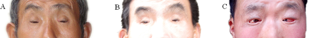 fissure length, short palpebral width, and epicanthus inversus are seen in the patients. A, B, and C demonstrate the eyelid feature of the probands in family A, family B, and family C, respectively.