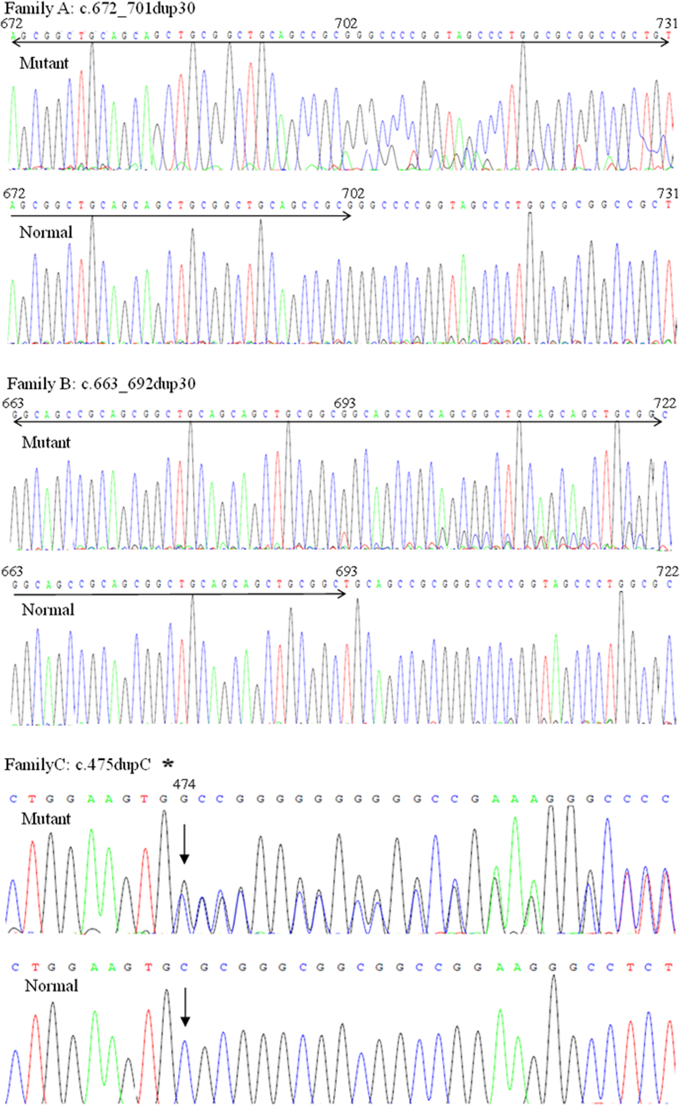 Sequence chromatograms of the mutations. The mutant alleles identified in the present study were compared with the normal alleles. The asterisk shows the reverse DNA sequence chromatograms.