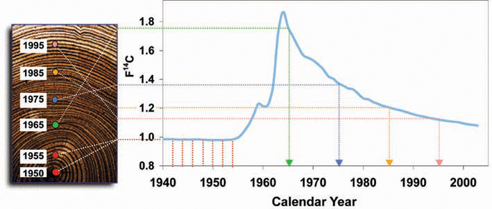 Figure 1. The 14C bomb curve is recorded in biomolecules. Aboveground nuclear testing nearly doubled the level of radiocarbon (as 14CO2) in the atmosphere between 1955 and 1963. The atmospheric 14C levels depicted by the dark blue trace are growing season averages for the northern hemisphere expressed in F14C units (fraction modern with δ13C fractionation correction). These 14C levels are recorded in annual plant growth and human diets. Human tissue incorporates the contemporary 14C signature of individuals’ food at the time of synthesis. Years later, specific biomolecules can be isolated and measured