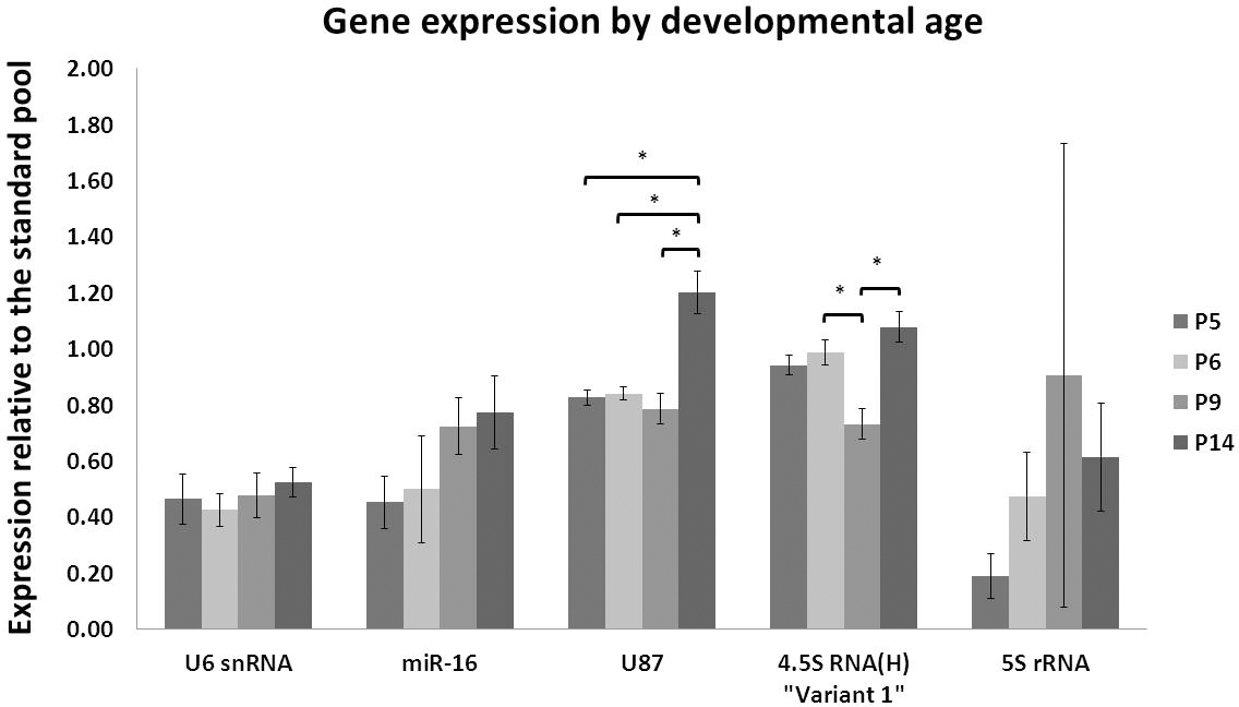 Figure 1. Average expression of five small ncRNAs and miRNAs compared at P5, P6, P9, and P14. Mean expression relative to the standard