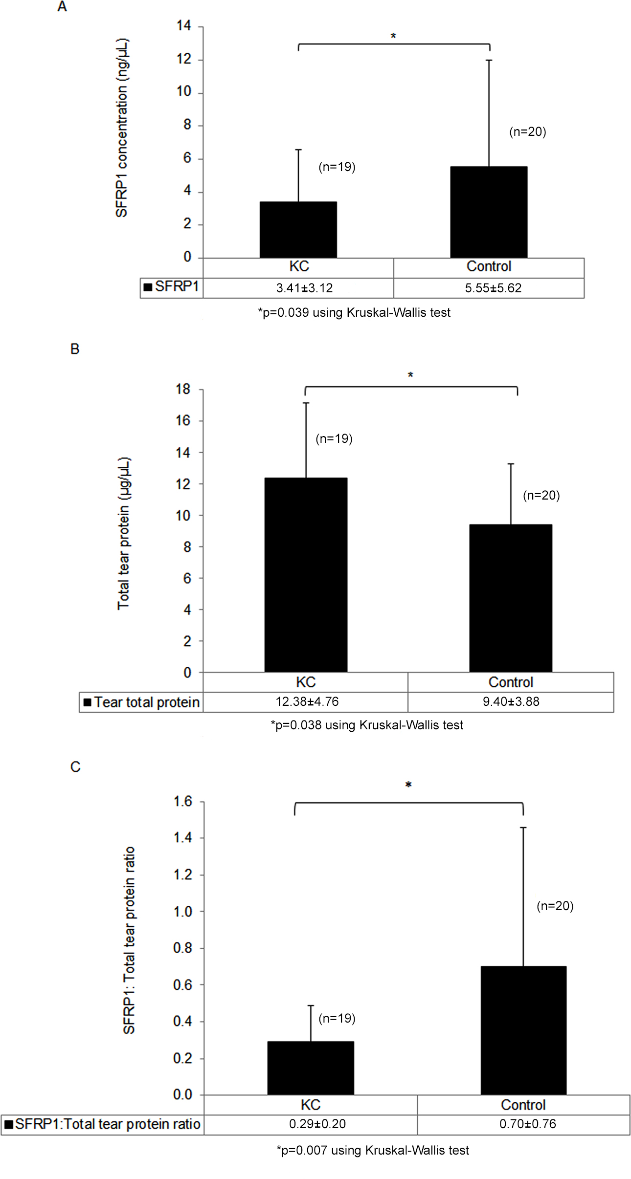 KC, compared to control patients. A: Tear SFRP1 concentration was significantly lower in age-matched KC than controls. B: Total tear-protein concentration in age-matched KC was significantly higher than controls. C: Ratio of SFRP1/ total tear protein was significantly lower in age-matched KC compared to controls. Error bar: standard deviation.