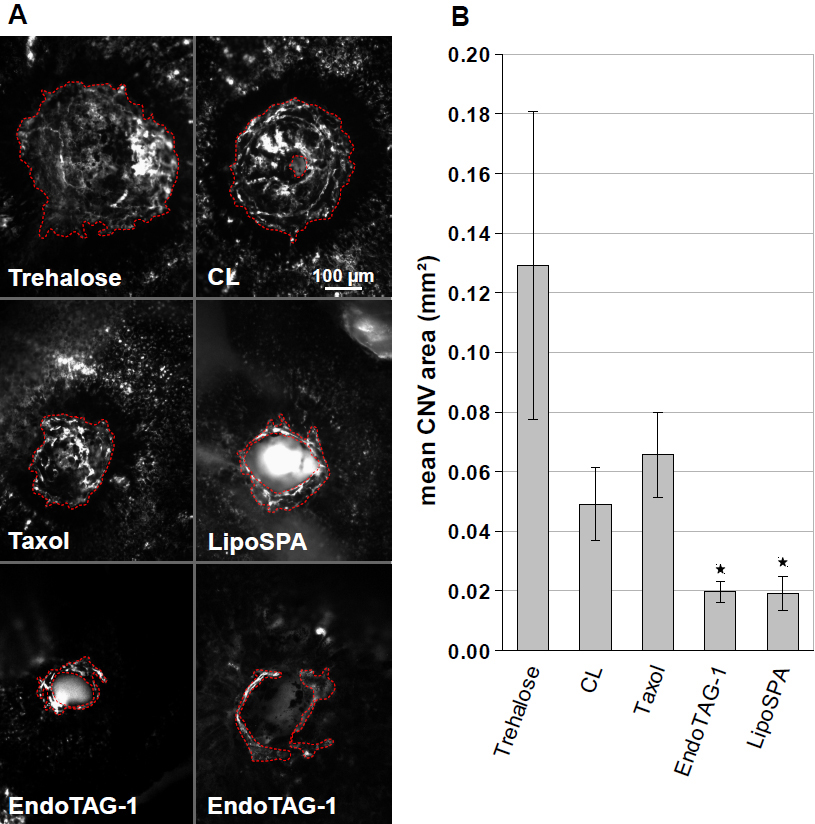 mean CNV area for trehalose to about 50%, EndoTAG-1 or LipoSPA reduced the mean CNV areas further. The differences between