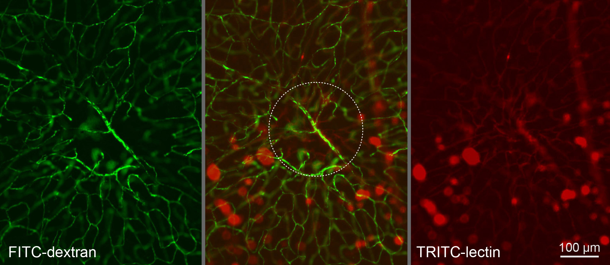 Dextran was washed out during lectin staining from the large vessels only but remained in the capillaries. The focus is on